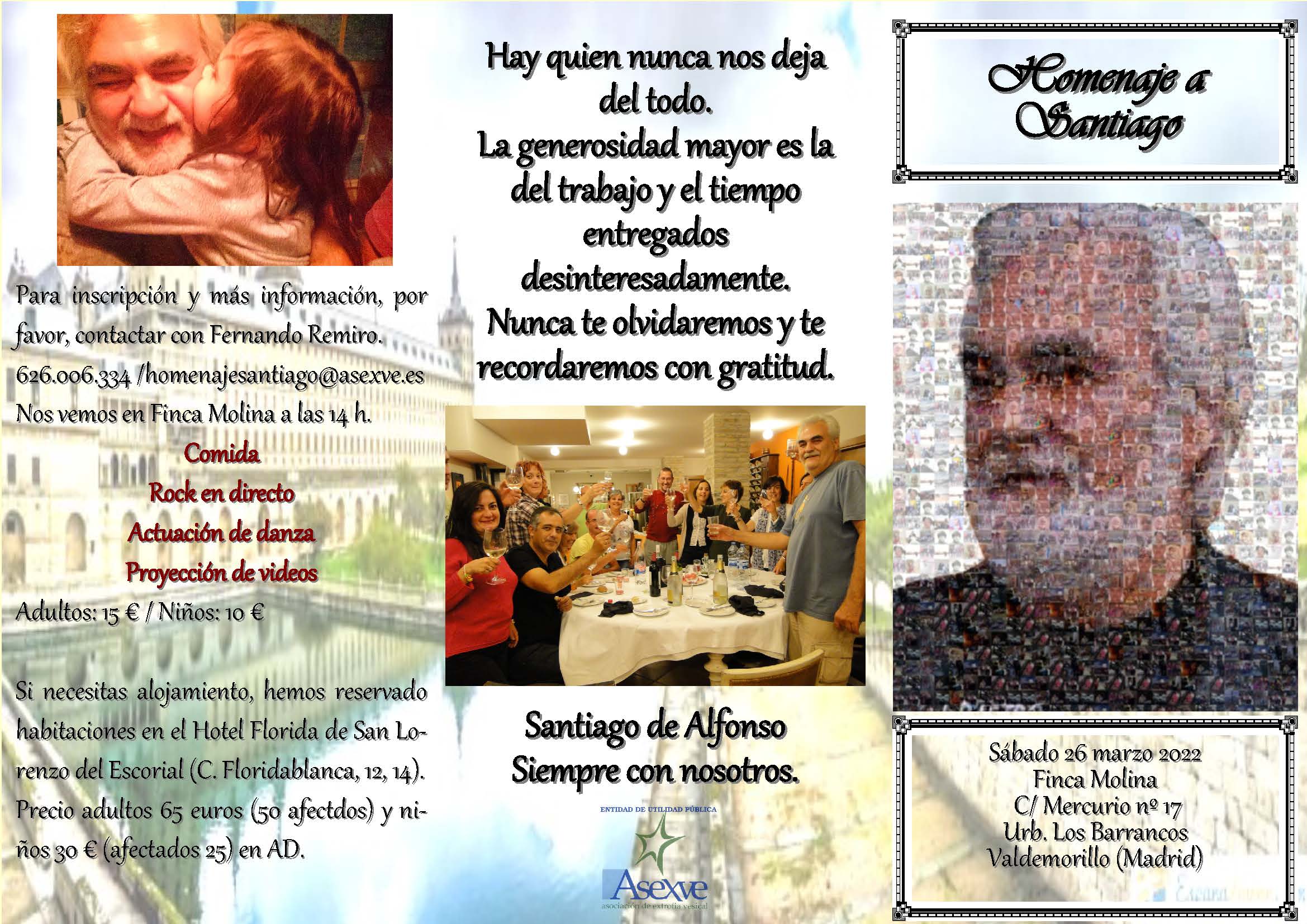 ¡Tenemos buenas noticias! ¡Ha llegado el momento de rendir homenaje a nuestro querido Santiago! El próximo 26 de marzo comeremos todos juntos en la Finca La Molina, a 12 km, de San Lorenzo del Escorial. Quienes queráis recordar y homenajear a nuestro amigo Santi apuntaos esta fecha en vuestra agenda. Para gestionar este evento se…
